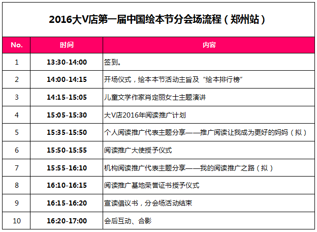 2016大V店第一届中国绘本节 · 郑州站牵手阅读 共享未来 2016 第一届中国绘本节暨全国亲子阅读 推广大会 尊敬的女士/先生: 您好! 在这个春意盎然,鸟语花香的季节,我们诚邀您于2016年4月15日在郑州参加由大V店主办、海燕出版社协办的“牵手阅读 共享未来”2016第一届中国绘本节暨全国亲子阅读推广大会。我们愿与您携手,共同推广亲子阅读! 在此,我们诚挚邀请您的莅临。 观书香墨彩 诵经典华章 这一切都关乎我们阅读的未来 请您与我们一起开启这封诚挚的邀请函 在初春时节 与各路大咖共襄盛举 解读亲子阅读未来大趋势 做阅读推广的同路人 “牵手阅读共享未来”2016 第一届中国绘本节暨全国亲子阅读推广大会 绘本作为孩子人生中的第一本书,它的生动趣味满足了孩子好奇的天性,为孩子打开了通往世界的大门。同时也是成人认识自己,引导、推广亲子阅读,成就孩子未来的精神之所。随着近两年绘本在中国的盛行,越来越多的知名作家、阅读推广人和绘本机构涌现出来,我们希望借发起本次绘本节的机会,让更多的家庭和亲子阅读推广人爱上绘本,爱上绘本阅读,将绘本节打造成为一场全新的全民阅读的盛会。 4月15日 PM:2:00-5:00 这里有最强势的嘉宾,与您一起探寻阅读的力量; 这里有最大牌的作家,与您一起切磋创作的灵魂; 这里有最具实力的阅读推广大使,与您一起解读绘本的魅力。 这是一次推广阅读的360°全视角大讨论,怎么读你手里的书,怎么去描绘有关阅读的未来,怎么放手去爱,由你说了算,这样的机会你怎能缺席? 主办/协办: 主办单位:果敢时代科技有限公司 协办单位:海燕出版社 大V店是MAMA+旗下主打产品,以亲子阅读为切入点,致力于妈妈成长的社群电商。以让妈妈轻松开店、随时随地学习,认识更多优秀妈妈为服务宗旨,是目前国内妈妈创业、学习、社交、购物的首选平台。 各大绘本馆 幼儿园机构 以及 对绘本感兴趣的朋友们 我们为大家准备了精美的伴手礼 先到先得哦~ |